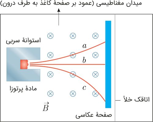 ب) شکل زیر طرح آزمایش سادهای را نشان میدهد که به کمک آن میتوان سه نوع پرتوزائی طبیعی را مشاهده کرد. پرتو ............ از نوع گاما است.