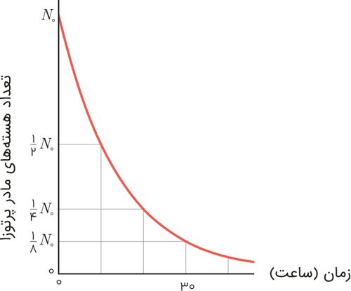 نمودار زیر تعداد هستههای مادۀ پرتوزا بر حسب زمان را نشان میدهد. پس از گذشت 80 ساعت چه کسری از هستههای اولیه باقی میماند؟