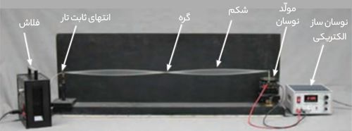 شکل زیر تصویری از اسباب آزمایشی را نشان میدهد که در آن تاری به طول 40 سانتیمتر کشیده شده است. این تار از یک سر به یک مولد نوسان و از سر دیگر به گیرهای متصل است و در آن دو شکم دیده میشود: