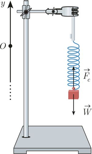 پ) در شکل زیر، وزنهای به فنر متصل و در حالت تعادل است. دو دلیل بیاورید که نشان دهد نیروهای و ، کنش و واکنش یکدیگر نیستند؟ (0/5)