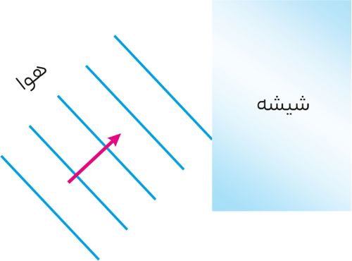 ب) در شکل زیر موج نوری فرودی از هوا وارد شیشه میشود. بخشی از موج در سطح جدایی دو محیط باز میتابد و بخشی دیگر شکست مییابد و وارد شیشه میشود:
