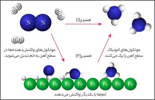 شکل و نمودارهای زیر دو مسیر پیشنهاد شده برای تهیه آمونیاک از گاز نیتروژن و گاز هیدروژن را نشان میدهد. با بررسی دقیق آنها به پرسشها پاسخ دهید. (1/75)